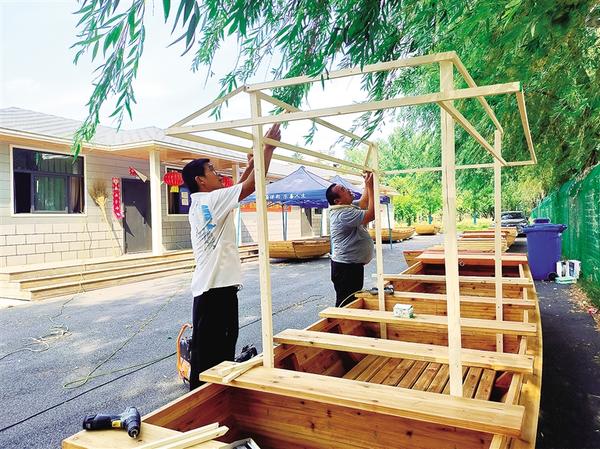 6月12日,两名工人正在搭建翎船上的彩色牌坊框架。随着我市第九届中华龙舟大赛的日益临近,新打造的6只表演“翎船捕鸭”的船只即将下水。“翎船捕鸭”是周口市非物质文化遗产项目,因其趣味性、观赏性极佳,深受广大群众喜爱。记者 沈湛 摄