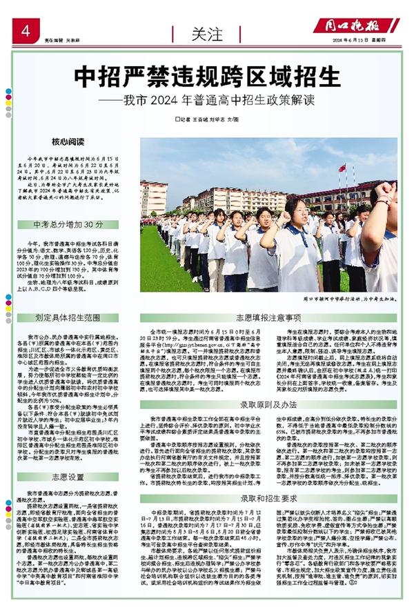 近日,为帮助全市广大考生及家长更好地了解我市2024年普通高中招生有关政策,记者就大家普遍关心的问题进行了采访。