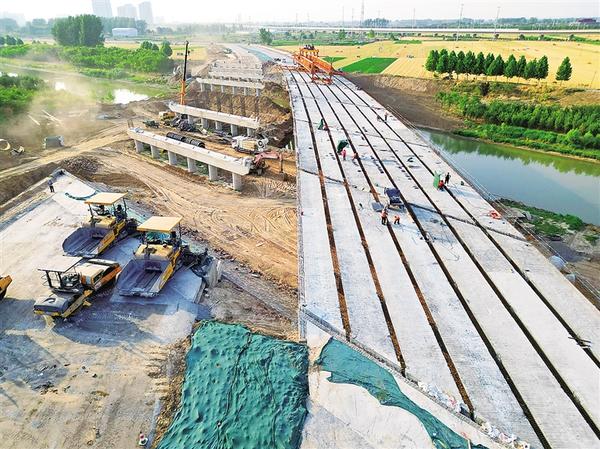 6月12日下午,施工人员在环湖路跨流沙河大桥东幅桥上进行焊接加固作业。据了解,环湖路跨流沙河大桥长180米,于2023年9月动工,经过半年的桥墩建设后,东幅桥在今年5月底迎来桥面施工,于端午节合龙。西幅桥因中间一处桥墩浇筑较晚,预计一个月后才能实施桥面施工。记者 梁照曾 摄