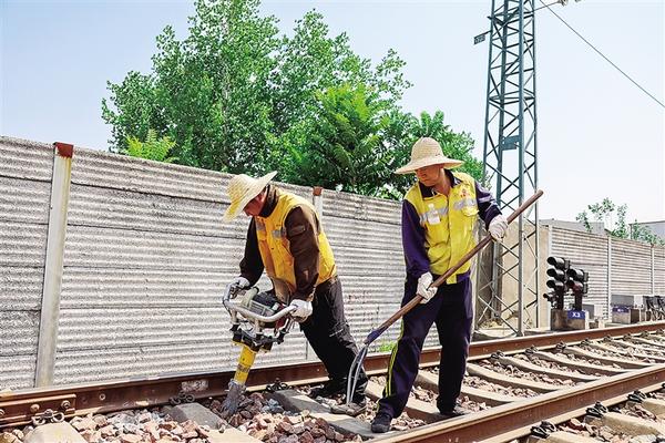 参与作业的职工都在与高温抢进度。负责扣件维修的职工操作内燃扳手对有松动的螺栓进行加固;负责起道的职工操作捣固机器,不停塞填着轨枕下方的石砟,使下沉的铁轨达到要求的高度;负责封砟的职工手拿钢叉,不断对缺砟地段进行道砟补充,增强线路的稳定性……