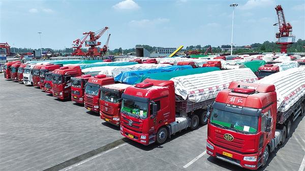 6月23日,运输化工原料和粮食的货车在周口港中心港作业区集聚,车上货物装船后将发往安徽、江苏等地。近年来,周口港中心港作业区围绕“商贸、航运、物流、综合服务”四大板块,开展“航运业务、物流业务、综合服务、金融服务和临港商贸”五大业务,全力助推我市临港经济高质量发展。记者 宋风 摄