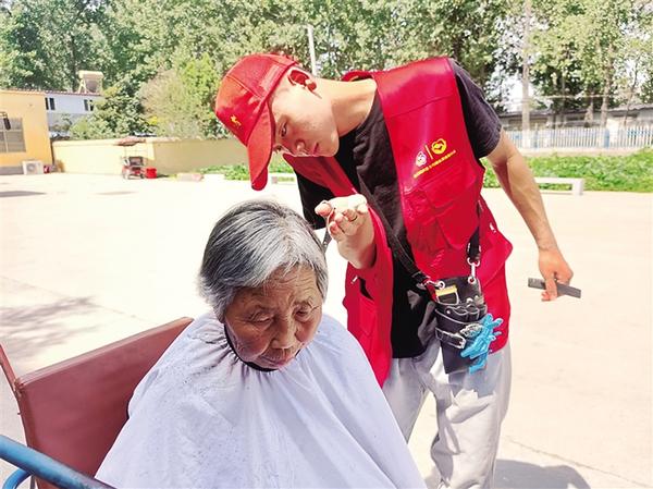 在为老人演唱的同时,暖心的理发送清凉活动开始了。志愿者党高瞻、白素芳、袁放放热情地招呼需要理发的老人入座。随着剪刀的“咔嚓”声,老人的发型瞬间清爽许多,人也显得格外精神。