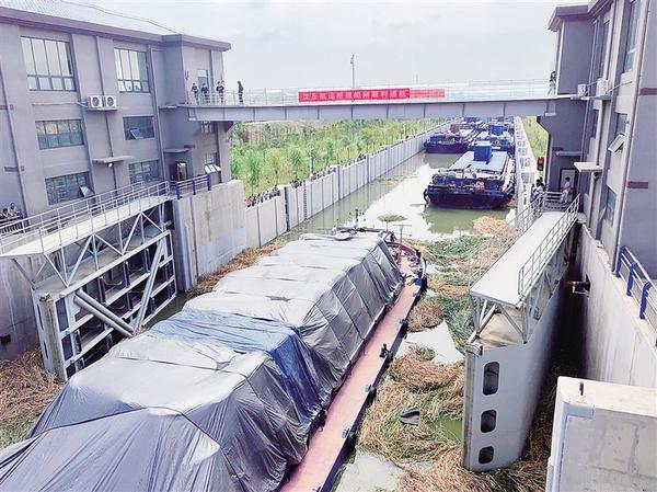 本报讯 为党的生日献礼!7月1日,随着“豫长泰888”“利辛货6588”“豫大成集666”“淮安漕运集6666”等货轮顺利通过沈丘航运枢纽船闸,标志着河南省首座千吨级船闸通航。