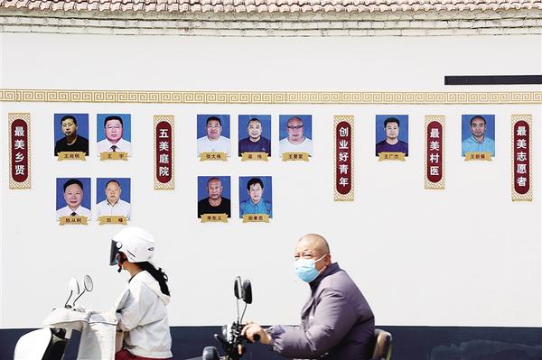 村民从形象墙前走过。王楼行政村每年举办两次表彰会,对爱心人士、乡贤等优秀人员进行表彰,倡树乡村文明新风尚。