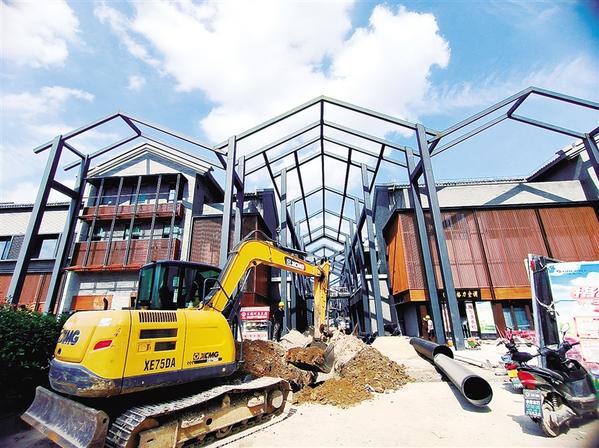 7月7日,关帝庙历史街区改造工程现场正在施工。近两年来,我市在关帝庙历史街区综合改造上注重街区功能提升,完善基础设施和配套服务,加快补齐“吃住行游购娱”等方面的短板,切实提高游客的体验感和舒适度。记者 沈湛 摄