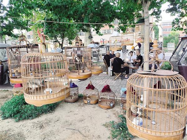 7月7日,周口大闸北端西侧沙颍生态谷聚集了一些爱鸟人士,40多个鸟笼一字排开,鸟主人则在一旁兴致勃勃地交流养鸟经验。据了解,这里每天都聚集不少携鸟前来交流的老年人,避暑遛鸟两不误。记者 沈湛 摄