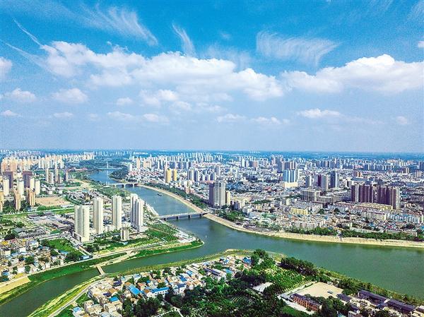 7月11日,记者俯瞰中心城区贾鲁河与沙颍河交汇处,场面蔚为壮观。周口素有“小武汉”之称。近年来,我市持续围绕“建港口、兴物流、聚产业、强服务、优生态、造港城”的目标,精心打造水运发达、交通便利,具有“国际范、中国风、中原韵、周口味”的现代化临港新城。记者 沈湛 摄