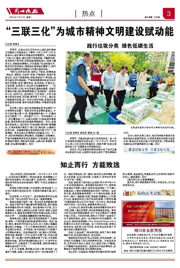 本报讯 为推进垃圾分类工作走深走实,进一步引导居民自觉践行垃圾分类,7月12日上午,市环卫中心深入川汇区部分街道社区,持续开展“垃圾分类宣传进小区”志愿服务文明实践活动。