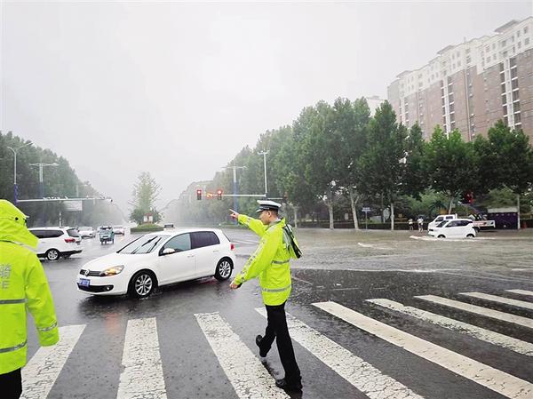 本报讯 7月15日早上,周口中心城区暴雨来袭,造成多条道路积水,给群众出行带来诸多不便。紧急时刻,周口交警坚守一线、严阵以待,加大对重点道路、重点区域巡查管控力度,最大限度将警力投入到抢险救援、隐患排查和疏导交通等各项工作中,化身风雨“守路人”,为群众撑起“平安伞”。