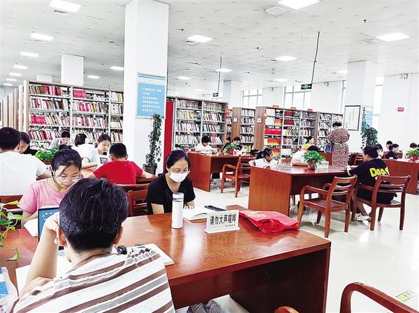 本报讯 近日,记者在市图书馆看到,一楼自习室、三楼青少年阅览室几乎坐满了人。