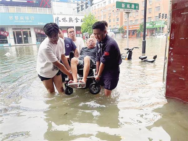 7月16日, 商水县红十字曙光救援队队员将一名高龄老人从家中转移出去。连日来,由于持续强降雨,商水县城区部分道路出现积水,给群众出行和生活带来不便。面对汛情,商水县红十字会迅速响应,立即组织红十字蓝天、曙光救援队队员参与救援工作。