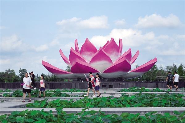 7月19日,几名游客从淮阳龙湖旅游区荷花苑雕塑前走过。据了解,荷花节期间,景区相关部门精心策划了一系列丰富多彩的活动,让广大游客在更大范围、更深层次乐享周口文化旅游发展成果。 记者 沈湛 摄