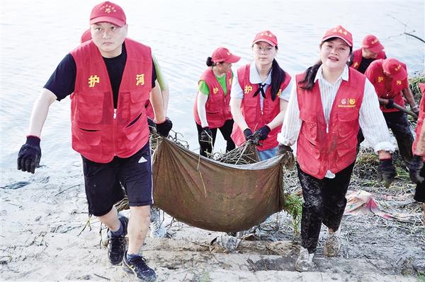 7月21日,志愿者在清理河道里的垃圾。当日,川汇区民间河长、市环境保护协会志愿者、大铁牛志愿者等40多人,在中心城区沙颍河沿岸开展“守护母亲河 环保志愿行”活动。志愿者清理河坡面积5000多平方米,捡拾、清运各种垃圾4500多公斤,使河道及两岸面貌焕然一新。 记者 王吉城 摄