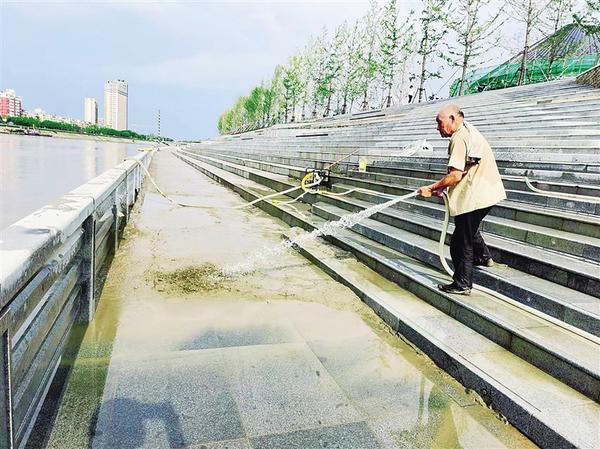 记者在清淤现场看到,园林绿化工人头顶烈日,不惧高温,他们或用铁锹铲泥沙,或用水枪冲洗路面,并采用“人工+机械”相结合的方式,在沿河步道开展清淤、冲洗、排水及垃圾清运工作,现场一派热火朝天的繁忙景象。