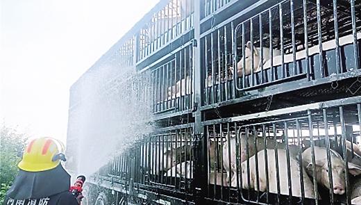 到达现场后,消防员看到载有生猪的车辆安装的是栅栏式车厢,分为上下3层,180余头生猪挤在一起,加之当时气温很高,车上的生猪出现了中暑的症状,它们有的耷拉着脑袋,呼吸急促;有的瘫倒在车上,微闭双眼。“从湖北出发的时候,这些猪还好好的,现在快被热晕了,需要紧急降温。”司机说。