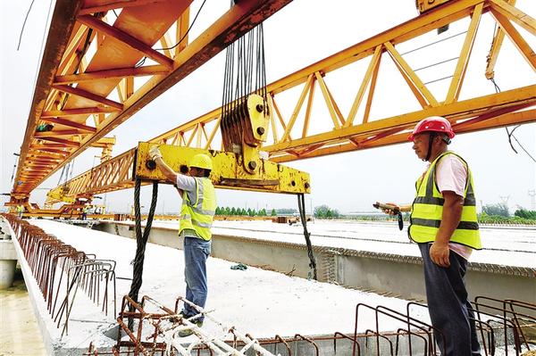 7月25日,工人们在吊装箱梁。当天下午3时许,随着最后一孔箱梁吊装到位,环湖路跨流沙河桥顺利合龙。据了解,环湖路跨流沙河桥长180米,于2023年9月动工。记者 梁照曾 摄