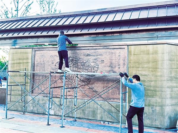 近日,工作人员为周口关帝庙照壁换上“新皮肤”。关帝庙照壁为周口关帝庙历史街区配套项目,南面为紫铜雕刻的周家口三寨图,北面为周口关帝庙营造史图。照壁蕴含了丰富的历史信息,兼具实用性与观赏性。