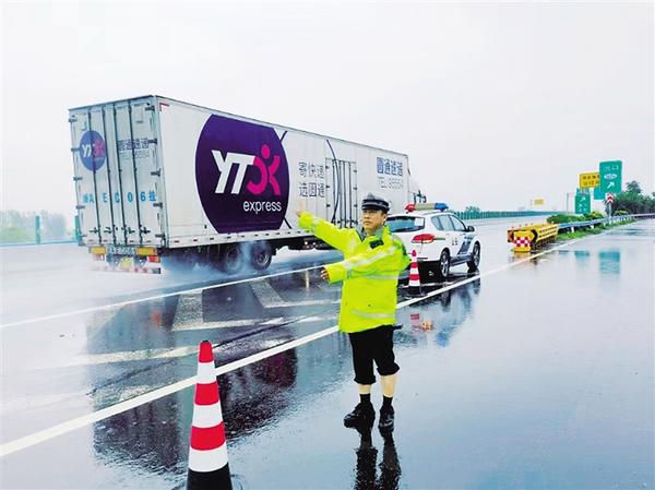 7月27日,高速交警在商南高速淮阳段事故易发区域雨中执勤。当日,我市大部分地区出现阵雨、雷阵雨天气,周口高速交警以“雨”为令,主动出击,雨中坚守,拉起交通安全“防护网”,全力保障辖区高速公路交通安全畅通。通讯员 郭利军 摄