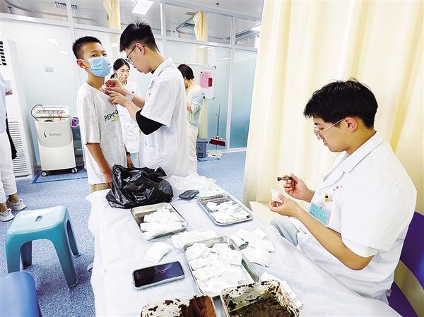 7月25日,医护人员为小男孩贴敷三伏贴。当日是中伏第一天,市中医院治未病科再次迎来“冬病夏治”热潮,不少市民来此体验三伏贴、火龙灸、督脉灸、拔罐、按摩等中医特色服务。记者 郑伟元 摄