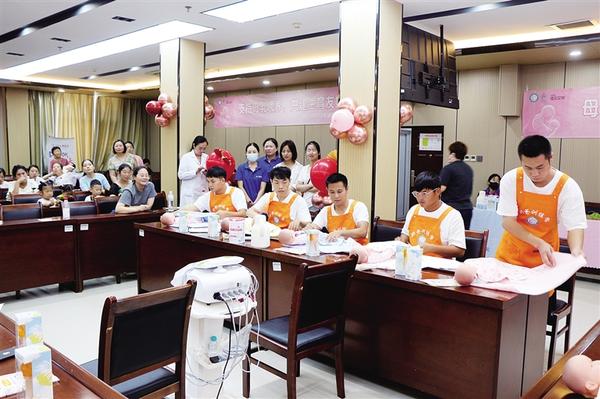 准爸爸学习如何打襁褓。8月2日,市妇幼保健院开设“支持母乳喂养 共建生育友好”“超级奶爸”训练营,教授准爸爸如何辅助准妈妈进行母乳喂养、如何更换尿布等,让大家正确掌握科学育儿知识与技能。记者 韩瀚 摄