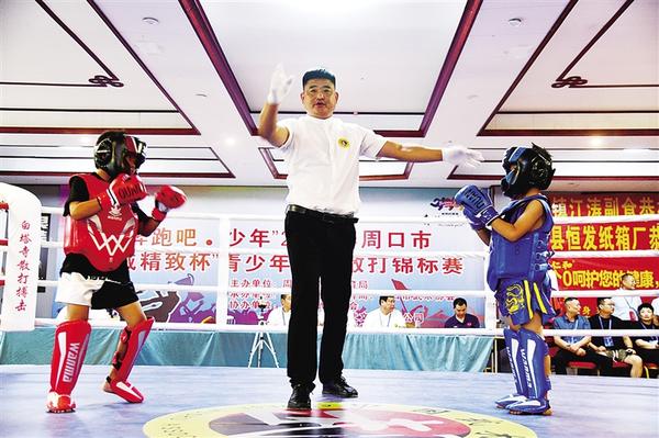 8月8日上午,由市教育体育局主办,商水县教育体育局、市武术协会承办,商水县武术协会、商水县博威传武文化有限公司、商水县精致双语学校协办的“奔跑吧·少年”2024年周口市“博威精致杯”青少年武术散打锦标赛在商水县谭庄镇举行,来自全市17所武校及俱乐部的300余名武术散打运动员参赛。图为比赛现场。