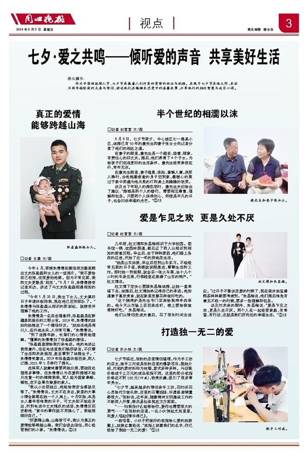 作为中国传统情人节,七夕节承载着人们对美好爱情的向往与祝福。本报于七夕节来临之际,采访不同年龄阶段的夫妻与情侣,讲述他们在婚姻或恋爱中的温馨故事,分享他们的相处智慧与成长心得。