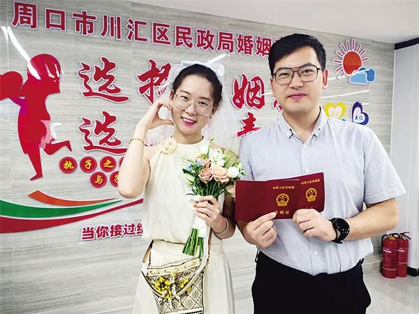 “我们是昨天晚上从上海赶回来的,专门在七夕这个美好的日子里领取结婚证。”29岁的郑照凯与女友曹雨荷是在上海工作的周口人,因七夕节当天是周六,他们选择乘高铁赶回来登记领证。
