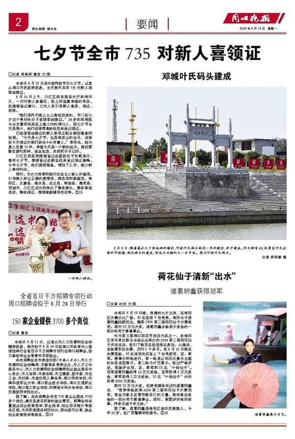 本报讯 8月10日是中国传统节日七夕节,记者从周口市民政局获悉,当天我市共有735对新人领取结婚证。