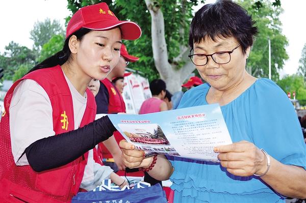 8月10日,志愿者向市民宣传环保知识。当天恰逢中国传统节日七夕节,周口市妇联、周口市环境保护协会的志愿者在中心城区沙颍河畔开展护河活动。志愿者捡拾垃圾,同时开展环保宣传等活动,与广大市民共赴一场守护母亲河的浪漫之约。记者 王吉城 通讯员 刘远志 摄