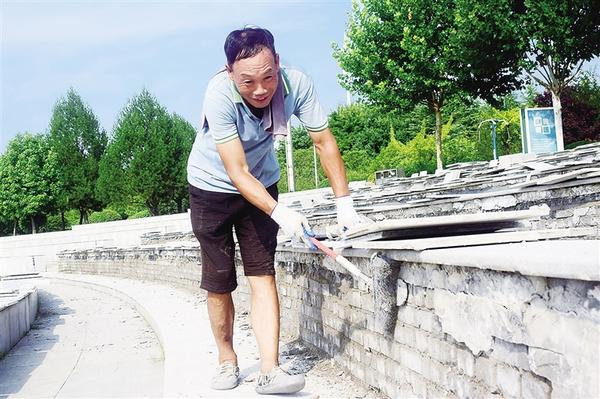 近日,在周口公园下沉式广场,工人顶着烈日,对坐台上残破的瓷砖进行清理。周口公园建成已有10多年,因风雨剥蚀,整个下沉式广场坐台上的瓷砖破损严重,存在安全隐患,有关部门于近日开始修缮。记者 梁照曾 摄
