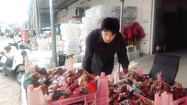 黄淮农产品大市场内人流如织,各色农产品琳琅满目。在广发果业,记者见到了正在卖货的老板贾云祥。他今年43岁,皮肤黝黑,脸上已经留下岁月的痕迹,短发中夹杂着数根白发。