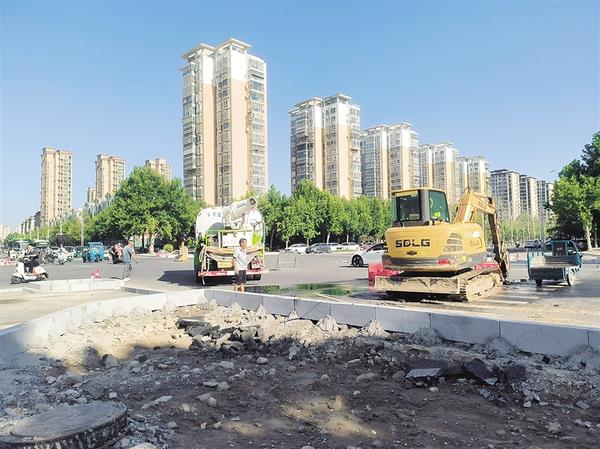 8月12日,周口大道与庆丰路交叉口的“安全岛”施工进入最后阶段。市政部门本着高效、安全、便民、实用的原则,结合道路现状,对“安全岛”进行科学施工。完工后,将提升该路口通行效率。 记者 沈湛 摄