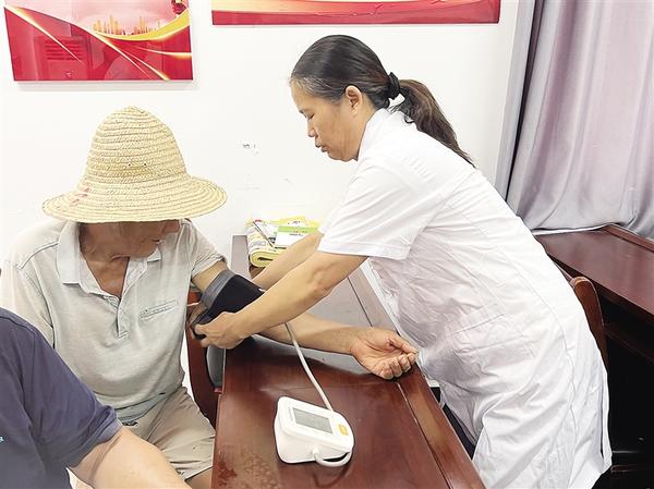 医护人员为村民免费测量血压。为提高群众的健康素养,普及健康生活方式,近日,市人民医院医疗专家团队走进川汇区城北街道邵火庙行政村开展义诊活动。他们根据每位村民的身体状况提出专业指导意见和建议,引导群众树立健康理念,增强防病意识。记者 刘伟 摄