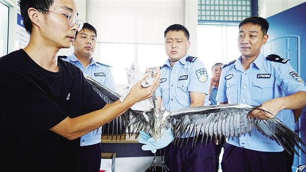8月11日上午,在淮阳区公安局葛店派出所,民警和区野生动物救助站工作人员正在检查一只灰色的苍鹭。当天,一只落单的国家“三有”保护动物苍鹭在葛店乡被人们救起,经检查幸无大碍,进一步养护后可放归大自然。