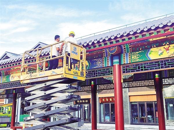8月11日,两名工人正在周口关帝庙广场西侧的风雨长廊检修灯具。周口关帝庙广场是市民演出、娱乐、休闲、锻炼的好去处,周边精心布置的亮化设施更为夜晚的广场增添了绚丽的视觉效果。
