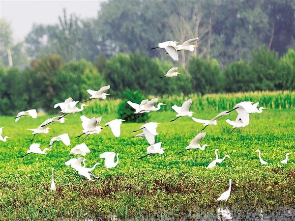 8月14日,在市城乡一体化示范区许湾街道古运河河道浅滩处,成群结队的白鹭在这里觅食,它们时而嬉戏、时而飞翔,构成了一幅美妙的自然生态画卷。记者 杜欣 摄