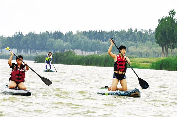 8月14日下午,桨板运动爱好者正加紧训练。当天,在周口引黄调蓄项目水上训练中心,几十名桨板运动爱好者挥桨逐浪、苦练技能,备战即将于8月18日在此举行的周口市第一届环湖桨板赛。