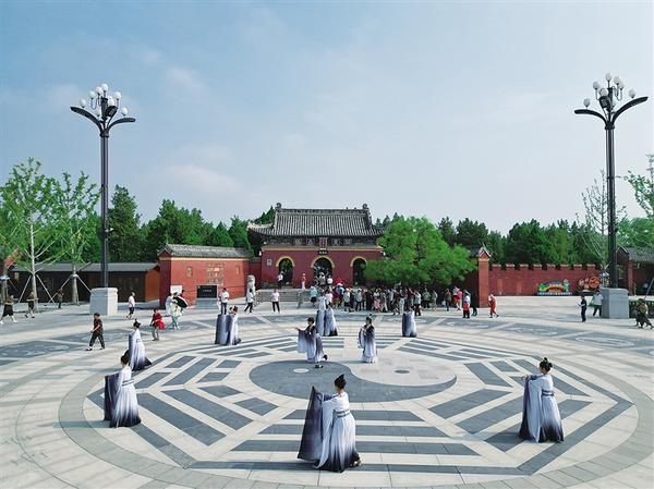 8月18日上午9点,在太昊伏羲陵文化旅游区午朝门前,一场以颂扬伏羲画八卦为主题的舞蹈《卦舞乾坤》正在上演,吸引不少游客参与其中。据了解,每逢周六、周日上午,该景区都会在午朝门、玉带桥、道仪门、统天殿前等举行类似活动。 记者 杜欣 摄