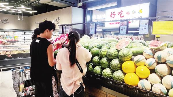 记者看到,超市内人头攒动,西瓜依旧占据水果区的C位。“之前家里天天吃西瓜,现在价格涨了,也不舍得买了。”杜女士看了看价格说,“西瓜看着挺好,就是贵了点,不如买别的水果。”
