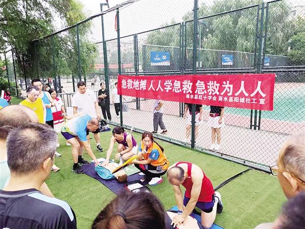 为进一步提升群众自救互救能力,普及应急救护常识,6月份以来,商水县红十字会联合阳城社工服务中心,组织志愿者到县体育活动中心、南干渠公园、县老年活动中心等人群聚集的广场和小区开展“急救地摊”系列活动,向广大群众传授应急救护、自救、防护技能。图为志愿者近日向群众演示急救方法。