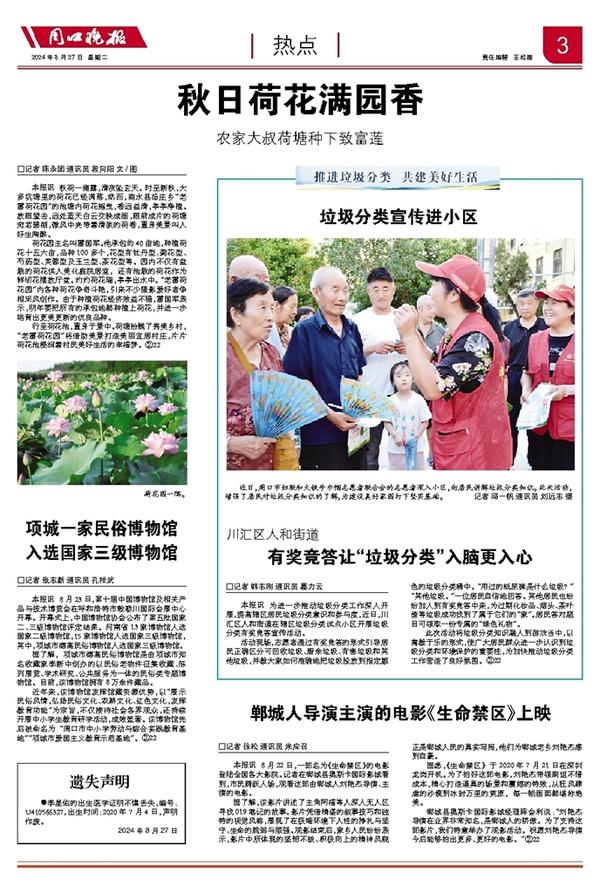 近年来,该博物馆发挥馆藏资源优势,以“展示民俗风情,弘扬民俗文化、农耕文化、红色文化,发挥教育功能”为宗旨,不仅接待社会各界观众,还持续开展中小学生教育研学活动,成效显著。该博物馆先后被命名为“周口市中小学劳动与综合实践教育基地”“项城市爱国主义教育示范基地”。②22