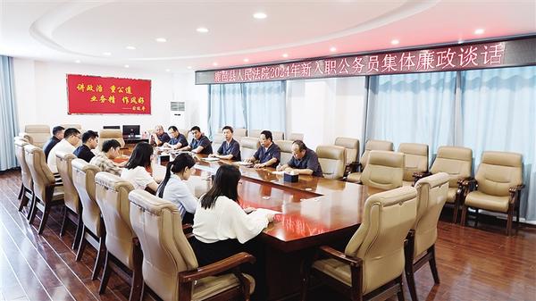 8月23日下午,鹿邑县人民法院党组对新招录的7名公务员进行集体廉政谈话,强调年轻干部要坚定理想信念、牢记初心使命、严守纪法规矩,扣好廉洁从政的“第一粒扣子”。通讯员 郭梦宇 摄