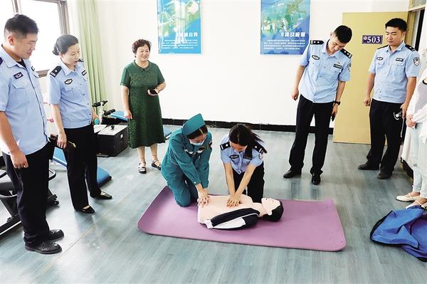 医护人员教授公安干警如何实施心肺复苏术。8月28日,周口市第六人民医院“社会心理健康金牌讲师公益巡讲团”走进周口市公安局经济开发区分局,为广大公安干警带来了一场别开生面的健康知识讲座,提高公安干警对身体健康的认识和重视程度,普及健康知识,增强公安干警的自我调适能力。记者 韩瀚 摄