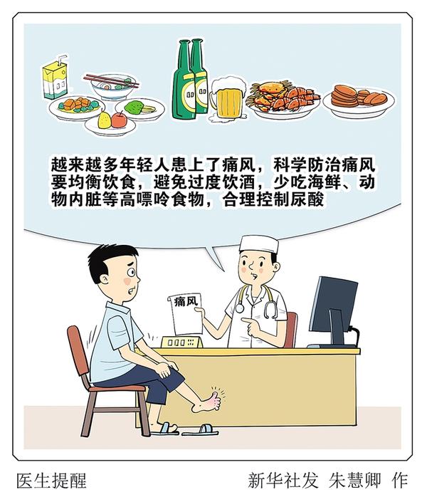 尿酸高、脚趾疼痛、关节红肿……这些都是痛风的症状。医生提醒,越来越多年轻人患上了痛风,科学防治痛风要均衡饮食,避免过度饮酒,少吃海鲜、动物内脏等高嘌呤食物,合理控制尿酸。新华社发 朱慧卿 作