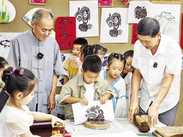 为弘扬优秀传统文化,加大非遗传播力度,让非遗文化走进校园,9月3日,省级非物质文化遗产项目周家口木版年画省级代表性传承人夏明月(左)、市级代表性传承人穆广科(右)走进周口市文昌幼儿园,开展木版年画进校园宣传、体验活动。此次活动的开展,让孩子们对非遗文化有了更深的了解和认识。记者 刘华志 摄