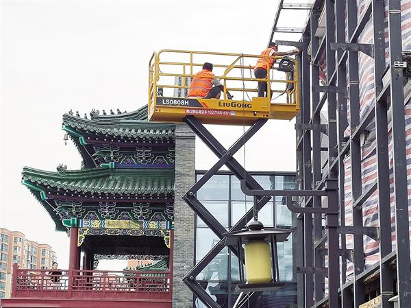 9月5日,两名工人在周口中心城区关帝庙历史街区茶街外侧墙体焊接构件,进行修缮提升。近年来,川汇区对关帝庙历史街区精细管理,丰富街区业态,提升街区品质,进一步打造消费新场景。记者 沈湛 摄