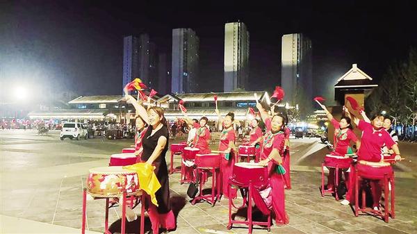 胡九(黑色上衣)带领姐妹们敲起大鼓迎中秋。
