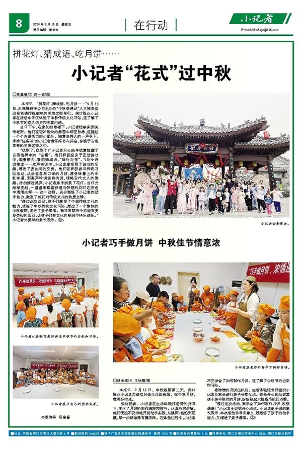 本报讯 “拼花灯、猜成语、吃月饼……”9月15日,由周报研学公司主办的“中秋奇遇记”人文探索活动在充满传统韵味的关帝老街举行。周口报业小记者在活动中不仅体验了中秋传统文化习俗,还了解了中秋节的悠久历史和丰富内涵。