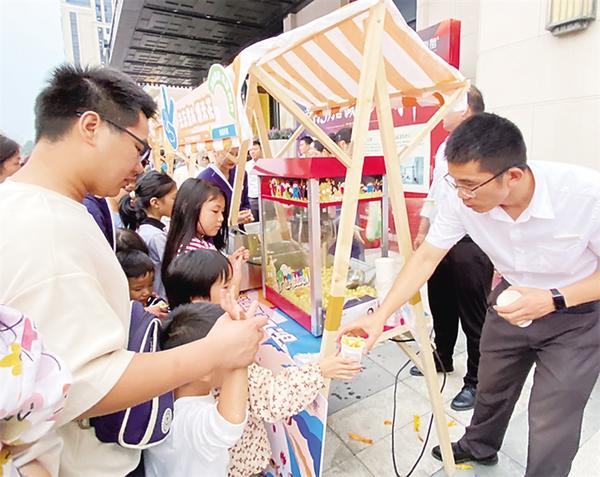 17时,演出还未开始,现场已经人潮涌动,十分热闹。“我们早早开始布置现场,看这边的免费小吃台、投篮机,还有含有中秋元素的氛围装饰,真的很吸引人,要不是因为工作,我也想跟你们一起参与进来。”该小区物业管家武女士笑着说。