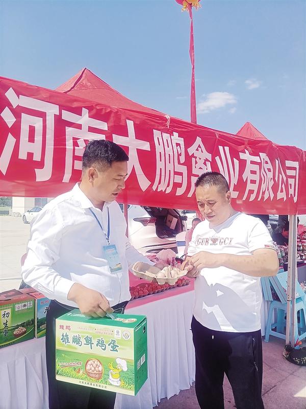 河南大鹏禽业有限公司负责人(左)向市民介绍产品。